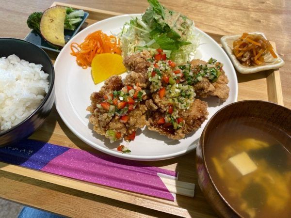 今回いただいたのは「油淋鶏定食」1100円です。見るからに美味しそうで気持ちも上がります。ジューシーでサクサクの鶏に甘酢のタレが最高に合います。リピーターが多いということも納得です。プラス250円でドリンク(コーヒー、和紅茶、日置の緑茶、リンゴジュース、温州みかんジュース)セットにもできます。