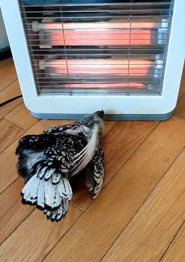 ストーブの前で暖をとるイヌやネコの映像は冬になって来るとよく見られますが・・・。 今回ご紹介する映像では、なんとニワトリがストーブの前を確保していました!