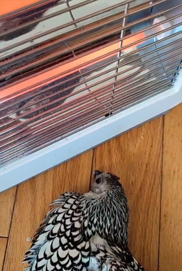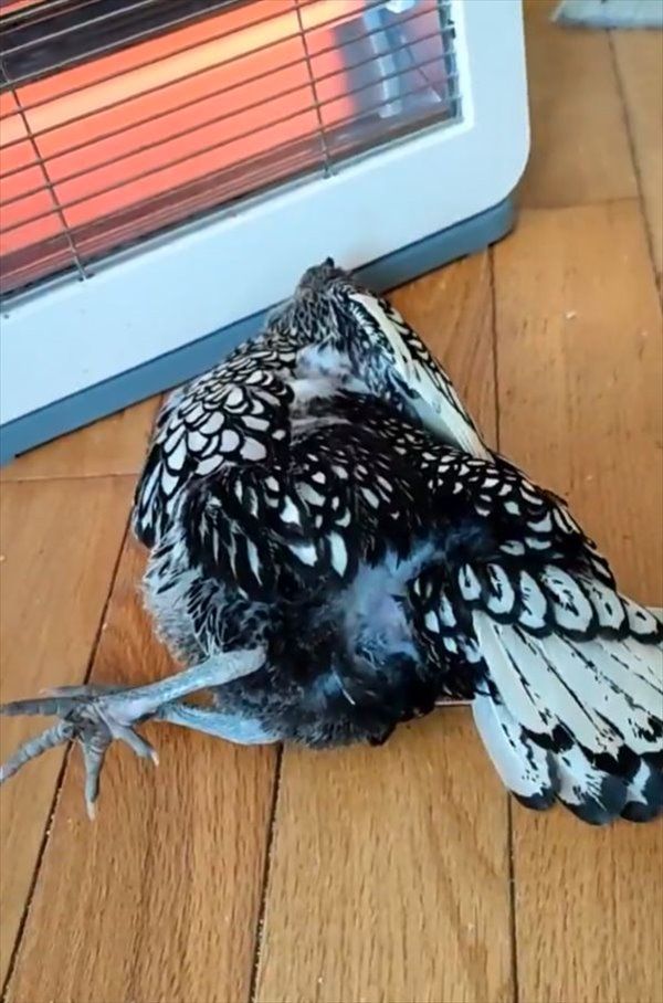 3. ストーブの前を陣取るニワトリ。すっかりとろけている姿が話題に!「鶏でもこんな風になるんですね」「とろけ具合に笑っちゃいました」