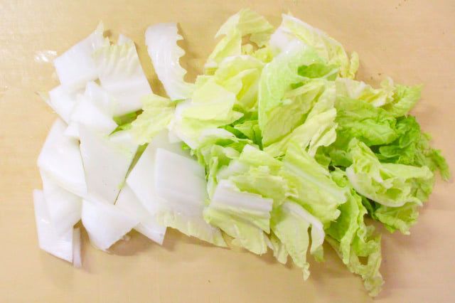 1. 白菜の内側の葉はざく切りに、外側から中央の葉は、縦半分に切ってからざく切りにします。葉はきれいに洗い、水気を切ります。