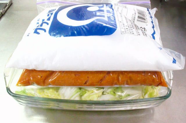 買い置きしていたみそと砂糖があったので、重石代わりに白菜の袋の上に乗せました。この状態で、30分おいておきました。