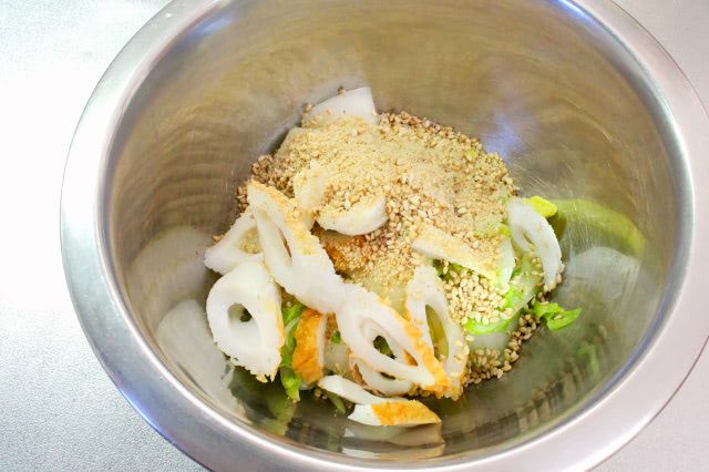ちくわを斜め薄切りにし、材料をボウルに入れて混ぜ合わせるだけ。白ゴマをたっぷりと加えたので、いい香りが広がっています。