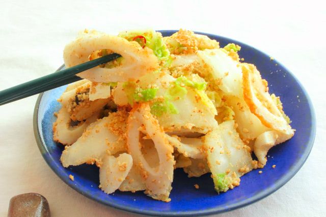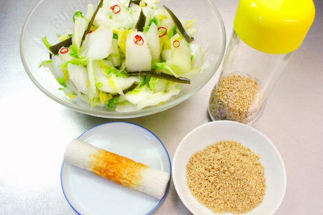 混ぜるだけでOKの「白菜漬けのごま和え」は、白菜もちくわも白ゴマをたっぷりまとっており、漬け物からおかずに大変身。
