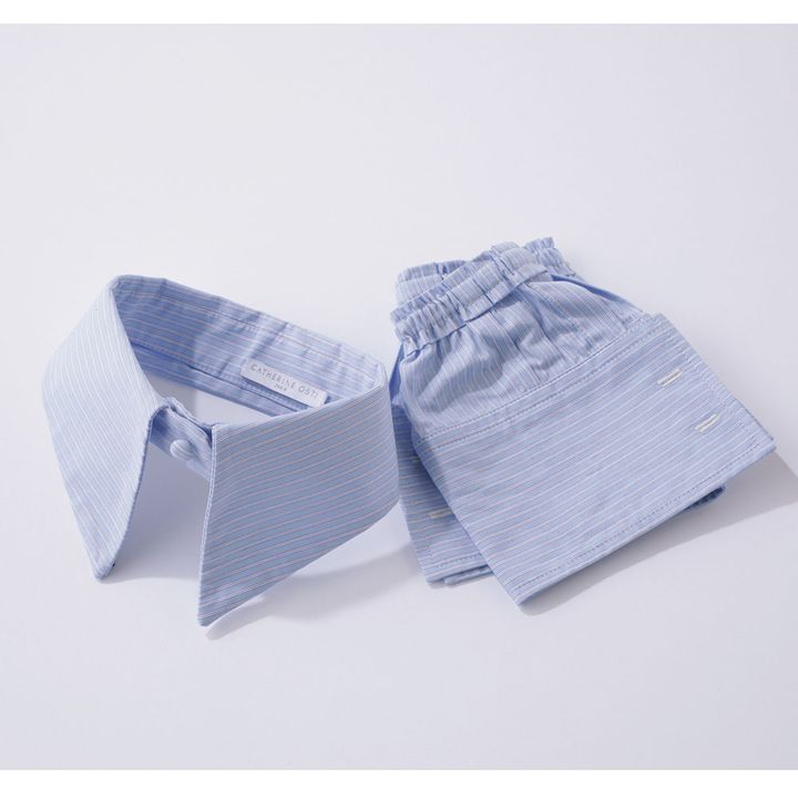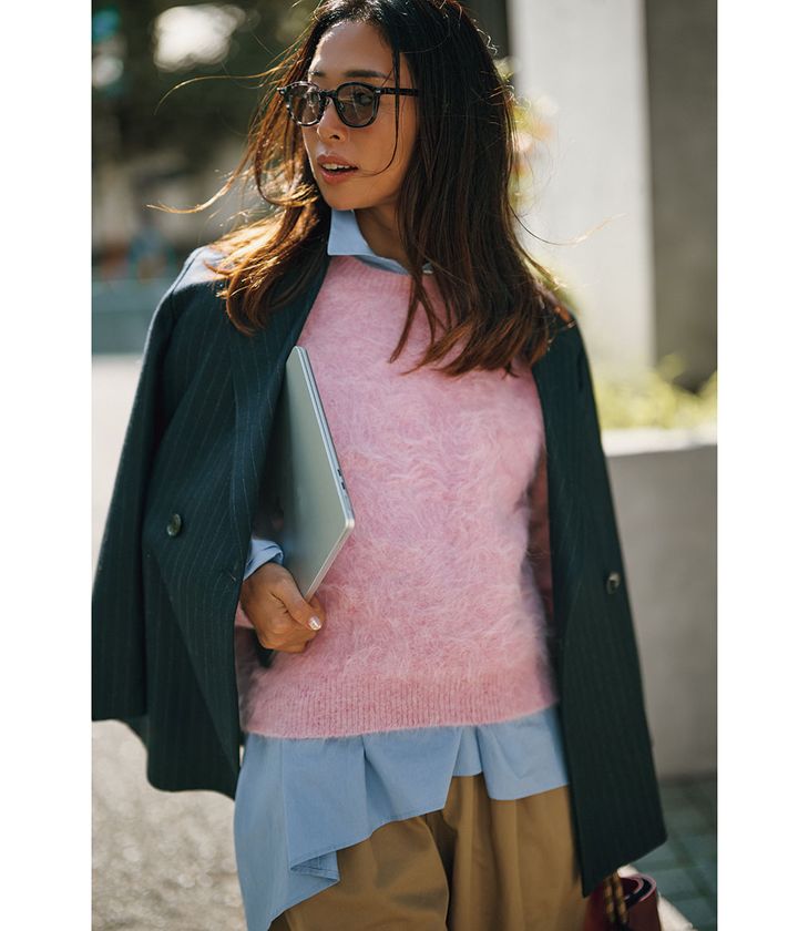ニットにシャツをINしたように見えるつけ衿&袖を追加すれば、レイヤードの窮屈さとは無縁なのにルーズに見えない理想的なゆるコーデが完成。アレンジが難しくマンネリしがちなニットコーデの絶好のスパイスに。