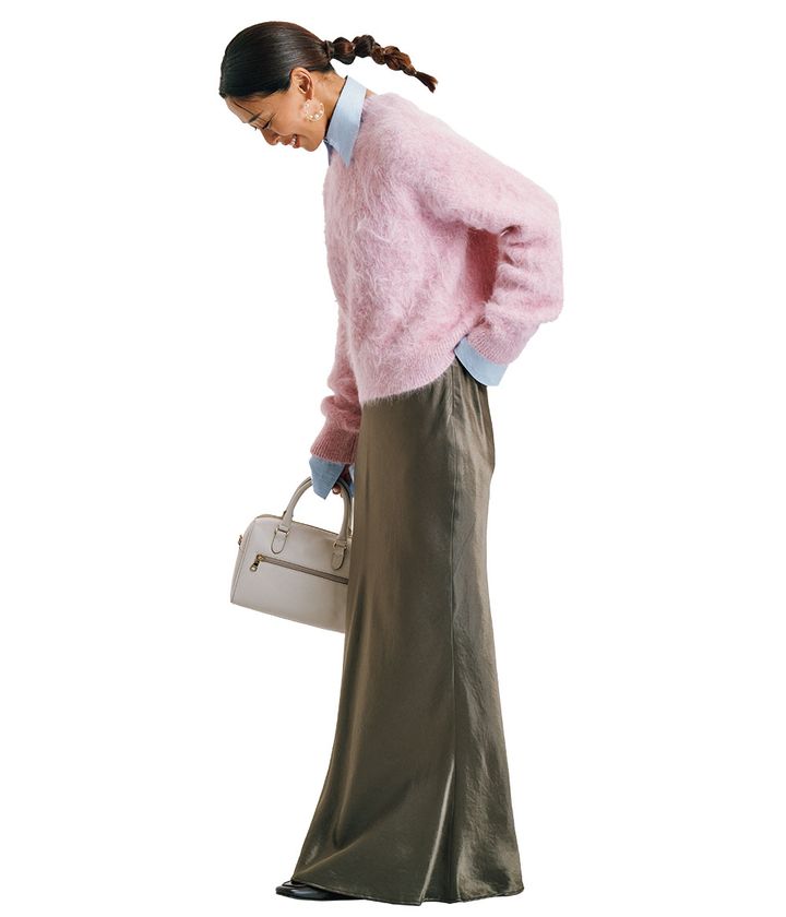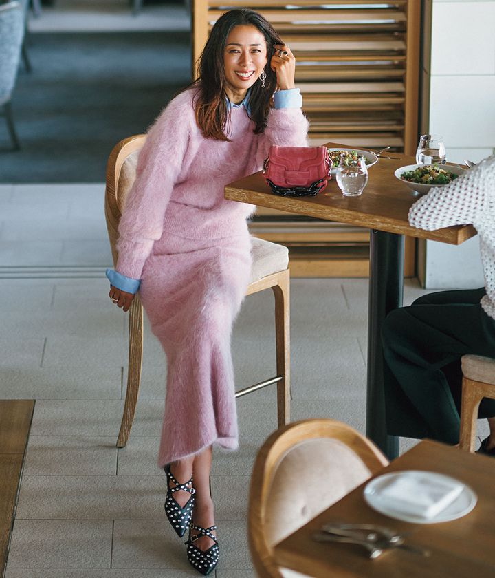 一際華やぐ大人ピンクのアルパカニット&スカートは顔周りを明るくみせてくれるから女子会ランチに最適! セットアップで着るとより洗練された印象に。