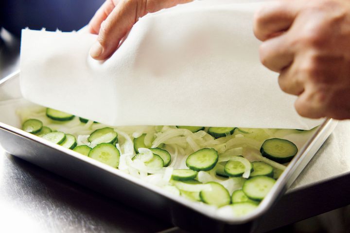 (2)きゅうりは幅3mmの輪切り、玉ねぎは横に幅3mmに切ってともにボールに入れ、塩小さじ1をまぶして20分ほどおく。水洗いして、水に3分ほどつけてからざるに上げ、ペーパータオルではさんで水けを取る。〈A〉は混ぜる。