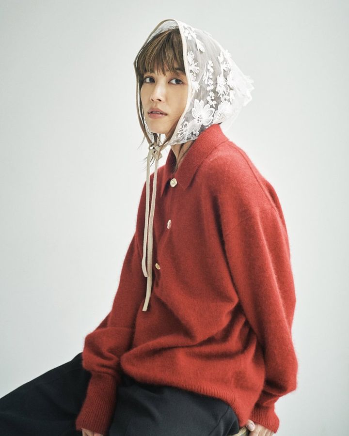 ニット¥27,500(ンニット)、パンツ¥17,930(メゾンスペシャル/メゾンスペシャル 青山店)、頭に巻いたストール¥6,600(プロヴォーク/ジャック・オブ・オール・トレーズ プレスルーム)