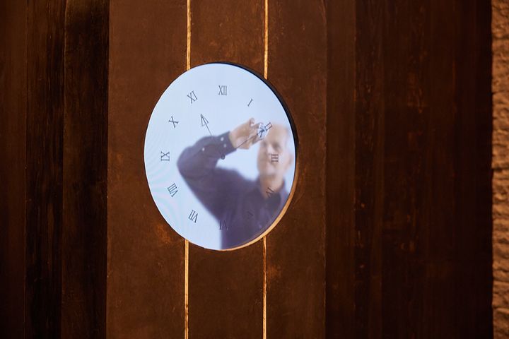 仕掛けを見るべく時計の液晶をしばらく眺めていると、おじさんの姿が現れました! このおじさんは時間が進むたびに現れ、時計の針を消して新たな時間を示す秒針をペンで書いてくれる、というなんともおもしろい仕掛け。秒針を拭いていたり、おやつを食べていたりと、時間によっておじさんのリアクションもさまざまだそうです。足早に通り過ぎてしまいそうな踊り場ですが、少し立ち止まって、このユニークな仕掛けをぜひチェックしてみて。
