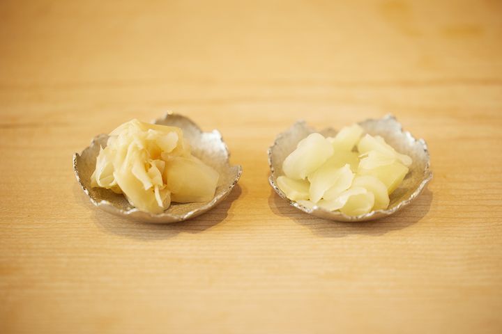 ちなみにガリは、ランチとディナーで分けているというこだわりよう。写真左がランチで提供されているガリ。鮨に合うように薄くスライスされています。写真右がディナーで提供されているガリ。お酒が進むように塩気を利かせた味に。
