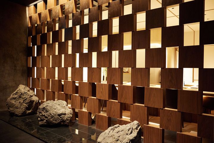 地下へと下りると、1階の開放的な雰囲気とはまた少し趣の違うシックなムード。目隠しになっている壁の奥に少し透けて見えるのが「鮨バー」です。