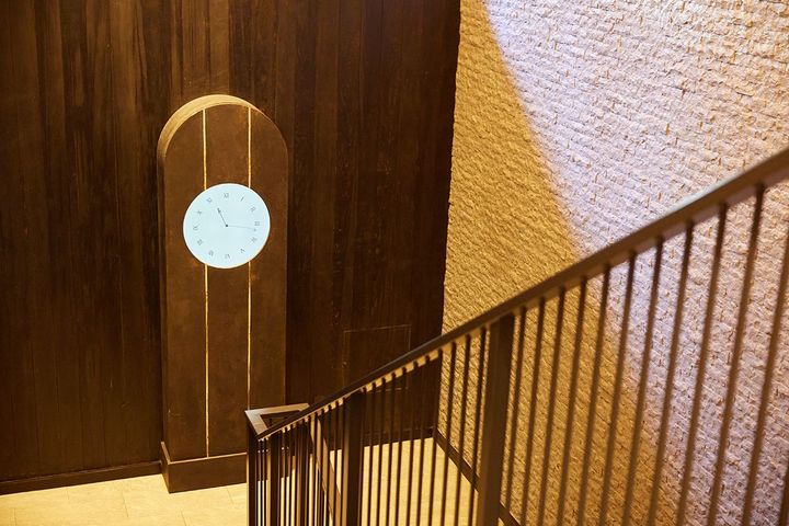 目指す「鮨バー」へは、階段で地下へと下りて向かいます。階段の踊り場には、昔ながらのふりこの置き時計を現代風にデザインした置き時計が。文字盤はアナログではなく、液晶です。そしてこの時計には、おもしろい仕掛けがあるというのです。その仕掛けとは……。