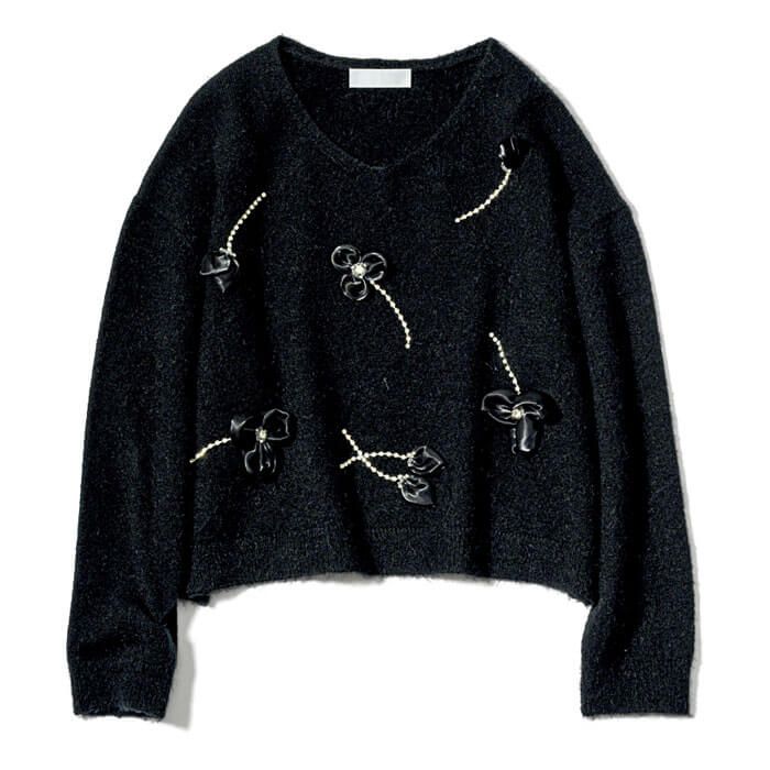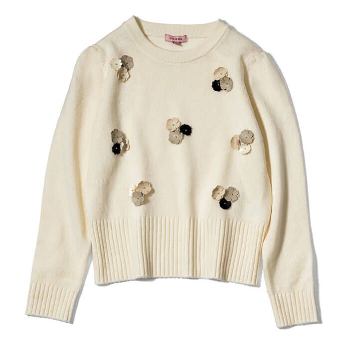 プリントや刺しゅうよりもキャッチーで可憐な印象を与えてくれる、今季話題の「モチーフ付きニット」にフィーチャー。今回は、立体感あるリッチな花モチーフをピックアップ。