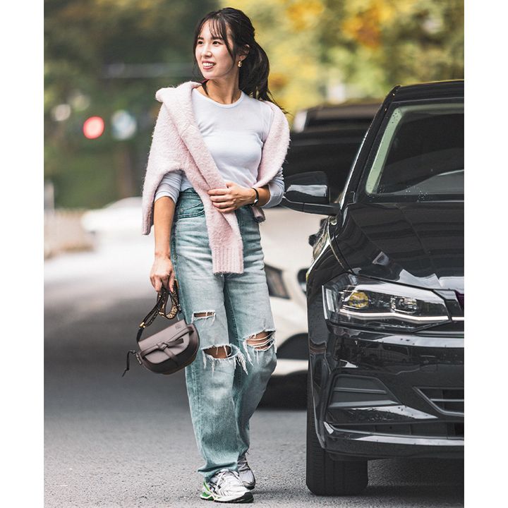 毎日、園まで車で30分かけて送迎するから自然と楽さと動きやすさが備わったデニム×スニーカーコーデに着地。ヤヌークのダメージデニムは、腰高で脚長効果が抜群!これ一つで“オシャレしてる感”を出してくれるので、朝のバタつきを一切感じさせません。スニーカーはASICSのゲルカヤノ14。シルバーとグリーンのラインが珍しく、ほっこりしがちなカジュアルコーデのスパイスに活躍中です。