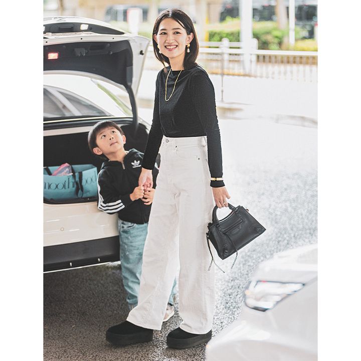 下のきょうだい2人を連れての車送迎なので、乗り降りがしやすく子育て中でもストレスフリーなデニム頼り。デニムをきれいめに穿くためには、ベルトでメリハリをつけるのが私的マスト。スタミキのデニムは後ろスリット入りの変化球デザインがお気に入り。3人の子育て中ですが、オシャレを諦めたくない今の気持ちに寄り添ってくれます。