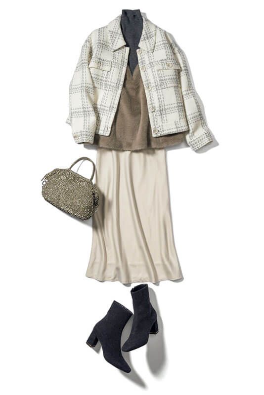ニュアンスカラーでまとめてレイヤードの重たさを払拭♪ 気温一桁の日はニットに重ねて防寒を意識。トップスにボリュームが出る分、落ち感のあるスカートでバランスよく。