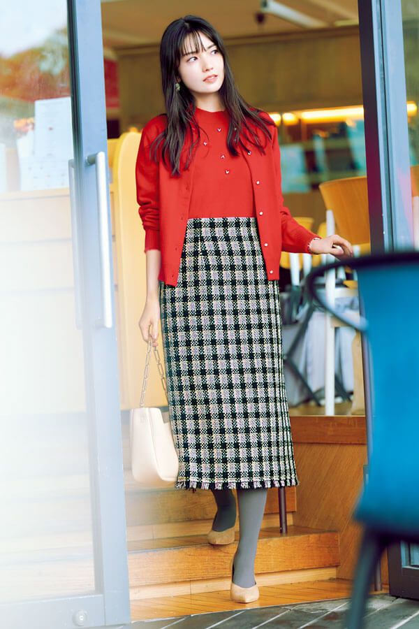 さりげないラメ感なら通勤もOK。旬カラーの赤いアンサンブルがグッドレディなチェックツイードとグッドマッチング。