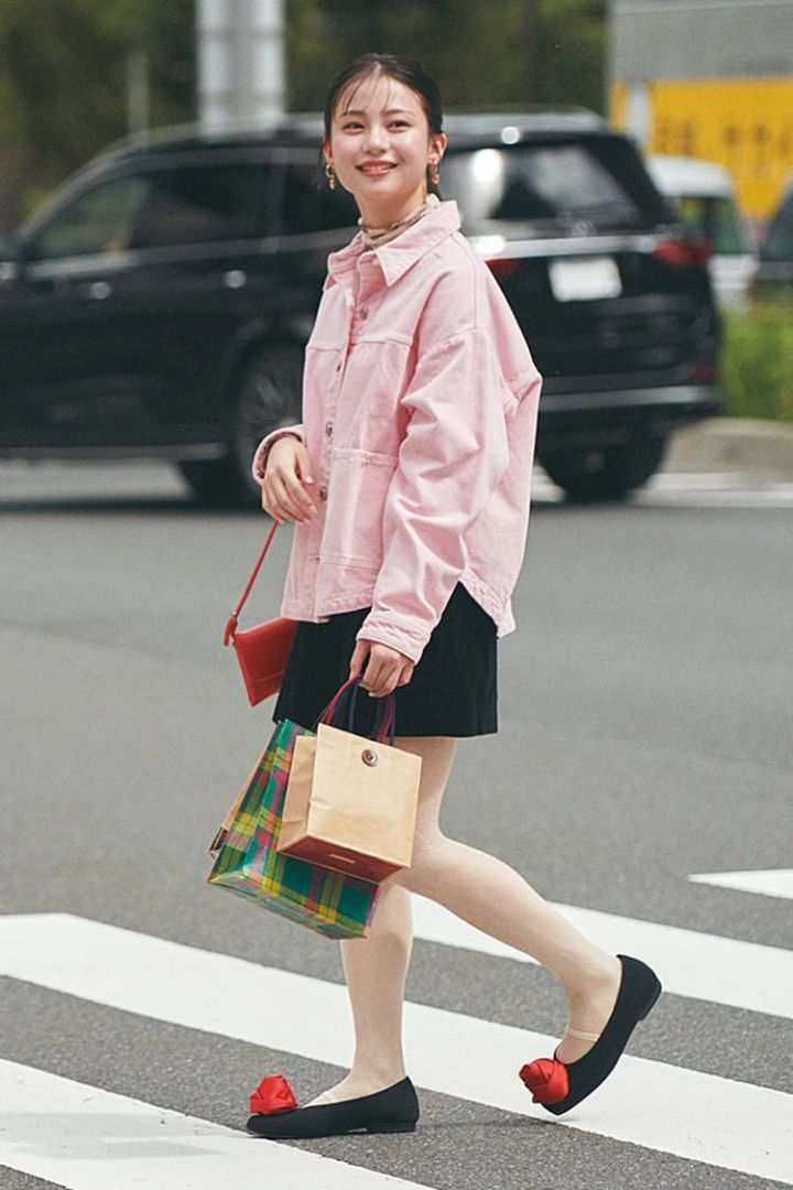 グレートップスがコーデを上品な印象に。差し色にピンクのソックスをチョイス♡