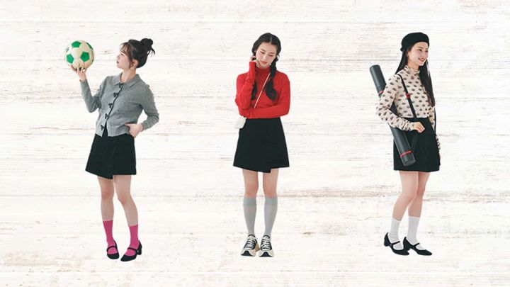 黒のスコートはカラーアイテムとも相性抜群!厚底スニーカー×ロングソックスで美脚見えを狙って♡