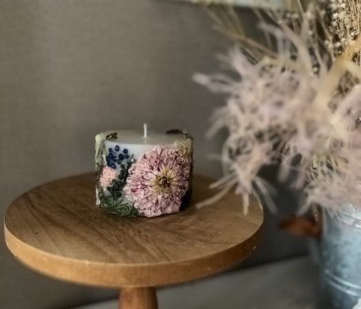 上記の写真はキャンドルアーティストSAQSIA CANDLEのsumieさんよりご提供頂きました。 sumieさん自身が生花からドライフラワーにして作成した手作りのボタニカルキャンドル。ダリアの花が特に美しく、いきいきとした色味が魅力です。