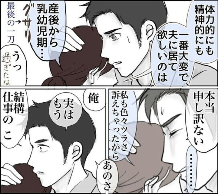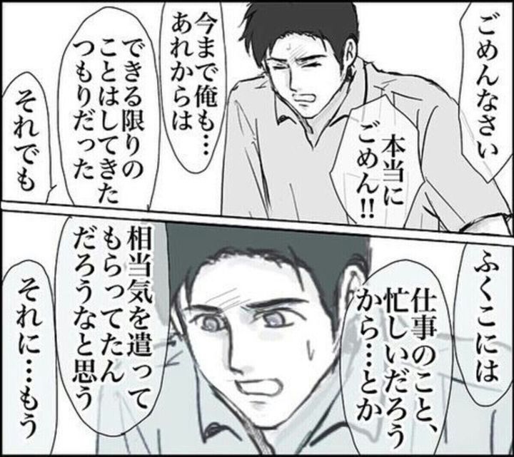 過去、子育てで大変だった時期、追い打ちをかけるように夫からの言葉で傷ついたふくこさん。全力で、当時の気持ちをぶつけ、猛省する夫。シリアスな場面ですが、お互いに歩み寄りました。