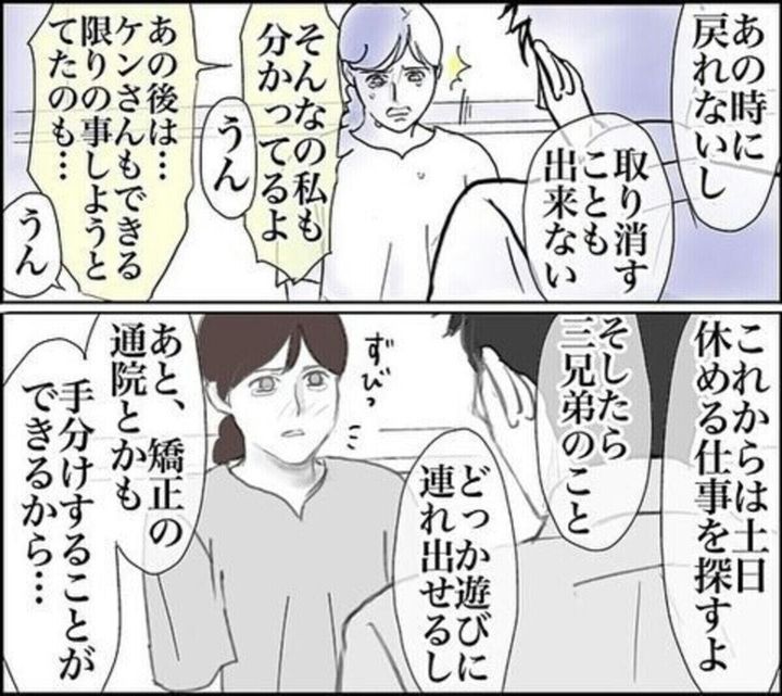 3兄弟のママ、安田ふくこ(@3kyoudiary)さんは子育てのお金について、夫婦会議をしました。ところがその矢先、夫から「仕事を辞めたい」と告げられます。仕事の話をきっかけに、ふくこさんも過去、子育てで大変だった時期に夫からの言葉で傷ついたことを思い出します。長年、苦しんでいたことを訴え、猛省する夫。そしてシリアスな場面で、長男が登場。もしかして、話を聞かれていた?