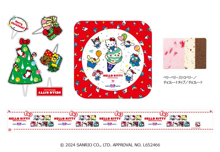 今年50周年を迎えたサンリオのハローキティをお祝いするクリスマス アイスクリームケーキ。ハローキティの耳のカチューシャとリボンをつけたサンリオの人気キャラクターたちがハローキティを囲み、まるでパーティーしているかのような華やかなデザイン。ハローキティをイメージしたいちごとチョコレートを組み合わせたフレーバー。フィルムや台紙も嬉しいコラボデザイン。付属のピックをみんなで飾って楽しめます。