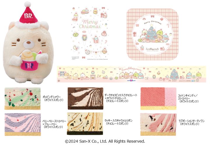 リースが飾ってあるおうちで、クリスマスの準備や休暇を楽しむすみっコたちをイメージしたデザインが魅力の、6ピースのアイスクリームケーキ。ポッピングシャワーやコットンキャンディなどみんなに愛されるフレーバー。ケーキを全部食べ終わると、台座にもかわいいすみっコたちがお目見えします。みにっコたちのピック付き。さらに、今年はキャラメルリボンとマスクメロンのダブルカップを持った「ねこ」のてのりぬいぐるみがついてくるので要チェックです!