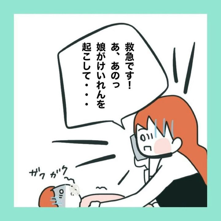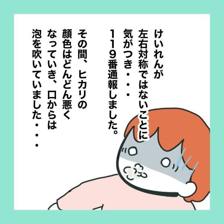 自宅で熱性けいれんを引き起こしてしまった次女・ヒカリちゃん。それでも、何とか平静を保ちながら、救急要請をします。実は、夫ともに前日に「左右対称じゃない熱性けいれんのときは救急車を呼ぶ」ことを確認していました。