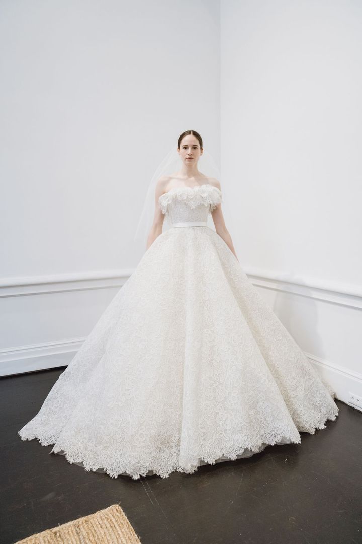 繊細なレースの美しさが際立つドレス。デコルテやスカートのスカラップがスイートな雰囲気を醸します。オフショルダーのロングスリーブボレロは取り外せ、ベアトップドレスとしても着こなしが可能。ドレス レンタル料¥990,000(オーセンティック銀座 tel.03-5159-3677)