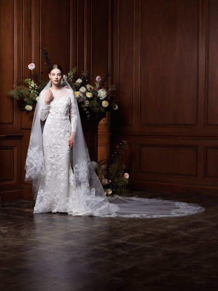 ドットチュール素材に立体的なフラワーモチーフのレースをあしらったマーメイドラインの一着。繊細な質感がラグジュアリーな花嫁を演出します。ドレス レンタル料¥660,000(オーセンティック銀座 tel.03-5159-3677)