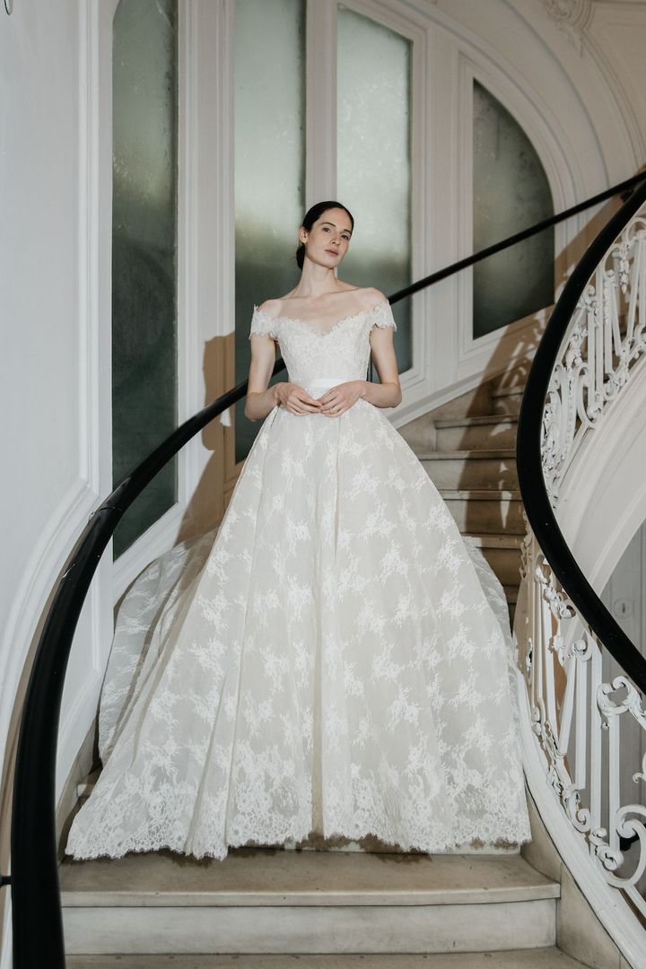 2025年の新作ドレス。デコルテを美しく見せるオフショルダースタイルです。最高級リバーレースを格子状にデザインし、美しい模様を描いたスカートが見事。2025年2月入荷予定。ドレス レンタル料¥924,000(ザ トリート ドレッシング アディション店 tel. 03-5778-3117)