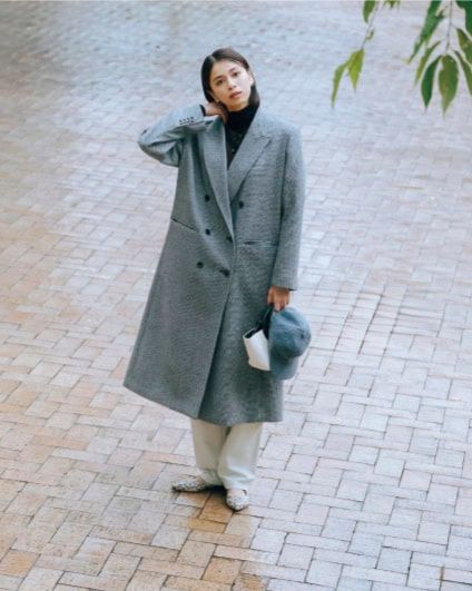 ダブル仕立てでしっかりと長さがあり、オーセンティックな佇まいを見せるチェスターコートが本命。テーラードコート¥60,500(ジャーナル スタンダード レサージュ/ジャーナル スタンダード レサージュ 丸の内店) カーディガン※セットアップパンツ付き¥30,800(クラネ/クラネデザイン) タートルネックプルオーバー¥7,700(アンヌーク) パンツ¥25,300(ザ シンゾーン/シンゾーン ルミネ新宿店) バッグ¥29,700(リンク) キャップ¥9,350(テンベア/テンベア トウキョウ) イヤリング¥17,600 (フォークバイエヌ/UTS PR) フラットシューズ¥71,500(ネブローニ/ピモンテ)