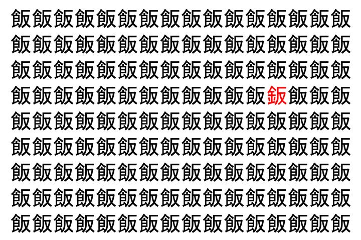 画像の中には、「飯」という漢字が縦に9行、横に16個並んでいます。 全部で144個となりますが・・・、そのうち1つは「異なる漢字」となってますよ!!