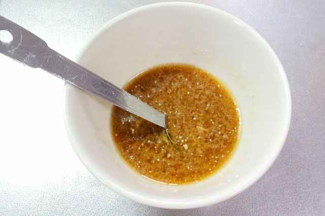 4. 2のサバ缶の汁にしょうゆ、オイスターソース、鶏ガラスープの素、砂糖、塩、片栗粉、ゴマ油を加えてよく混ぜます。