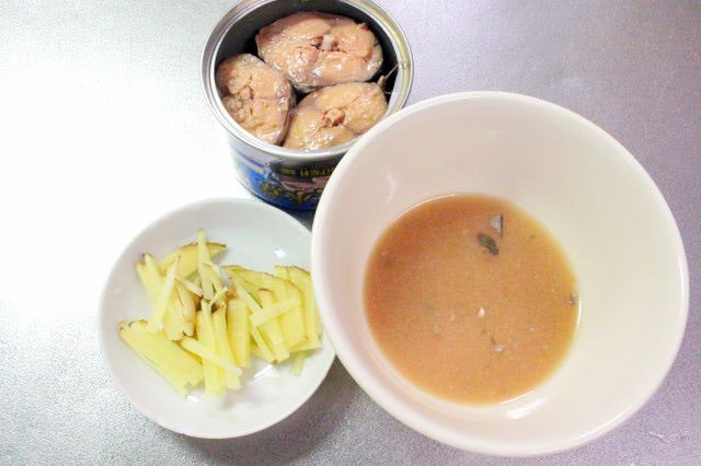 2. しょうがを太めの千切りにし、サバの水煮缶の汁を分けておきます。