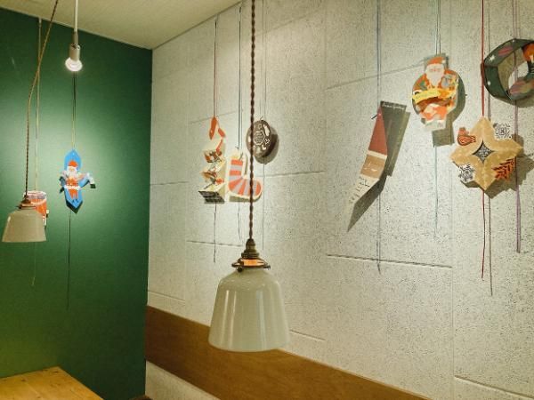 クリスマスのペーパーオブジェが壁のあちこちに…。 店主さんにお聞きしたところ、親睦の深いグラフィックデザイナーさんの作品とのことで、お洒落な様々なクリスマスグリーティングカードが紹介されてます。楽しい仕掛けも工夫があって、ずうっと見入ってしまう…。