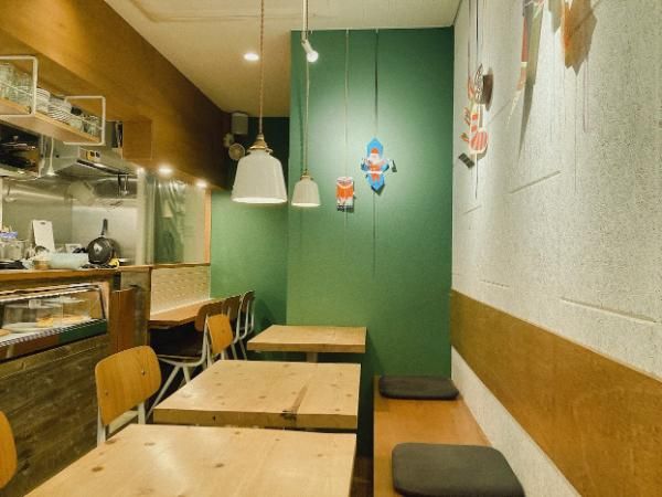 お店の中に入ると、緑色の壁。そして、低く下げられたペンダントライト。なんともお洒落。 すっきり洗練された雰囲気ながら、どこかクラシカルで温かみあるインテリア。店主さんのこだわりを感じます。