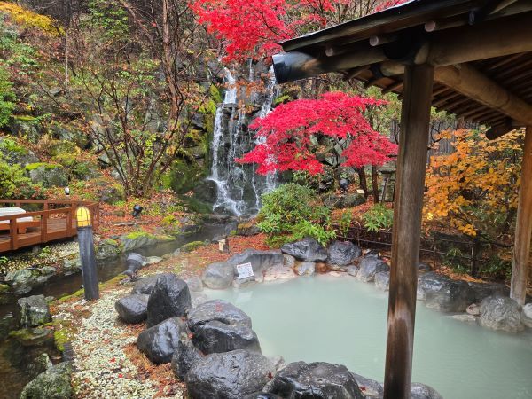露天に出てみるともう冬の入り口だというのに温泉の熱で紅葉が残っており、息をのむような美しさ。