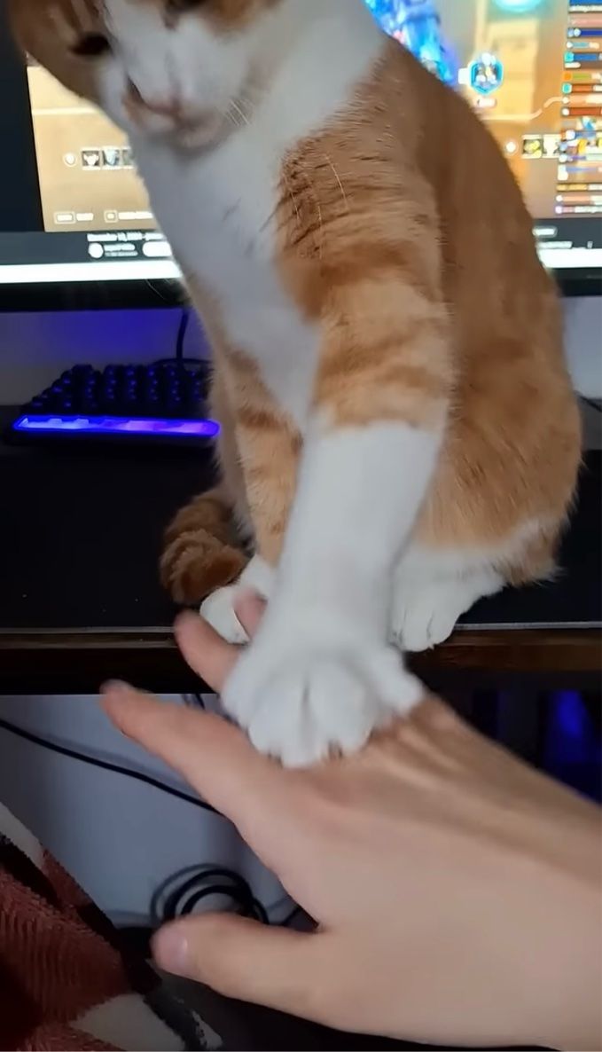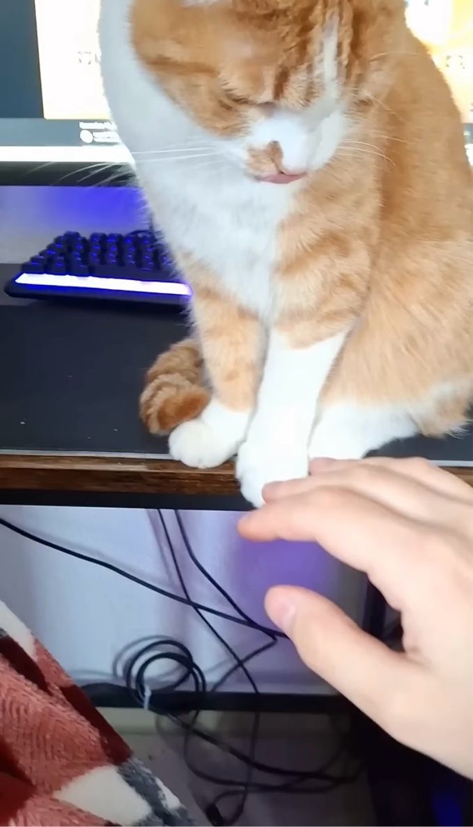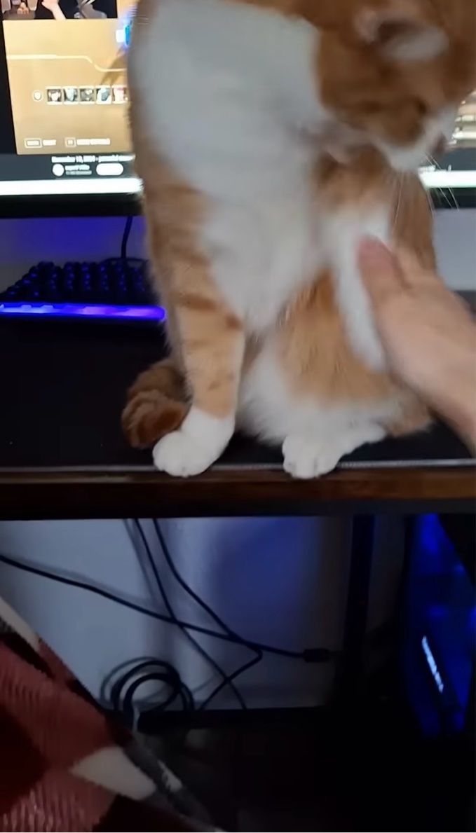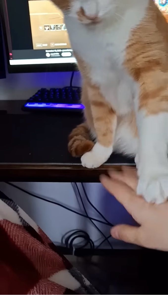 ️パソコンの前に座り込んで動かないネコ。 別の場所に移動してもらおうと手を伸ばした飼い主さんですが、毅然とした態度で立ち退きを拒否されてしまいました!