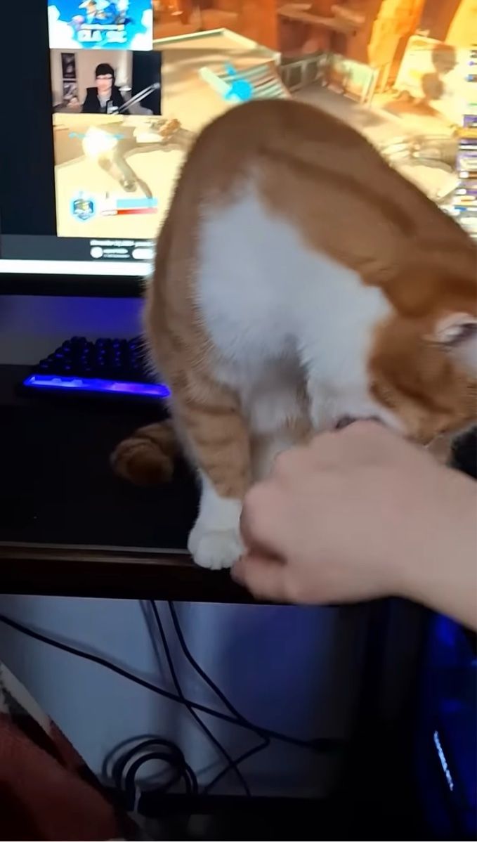 3. ゲーム中のパソコンの前に座り込むネコ。移動してもらおうと思ったけれど・・失敗!【海外・動画】