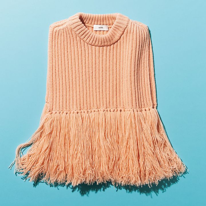 ざっくりニットに、極細のフリンジをたっぷりあしらったベスト。脇を縫っておらず、すぽっとかぶるデザインです。