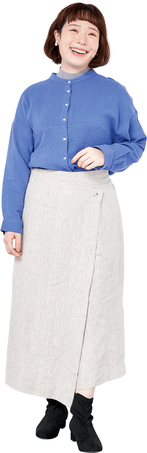 一見スカートのように見えるリネンパンツ。アシンメトリーなラップデザインで縦ラインを強調し、スッキリ見えを叶えながら動きやすさも抜群。ブラウスはインすることでウエスト周りもスッキリ、きちんと感も演出。