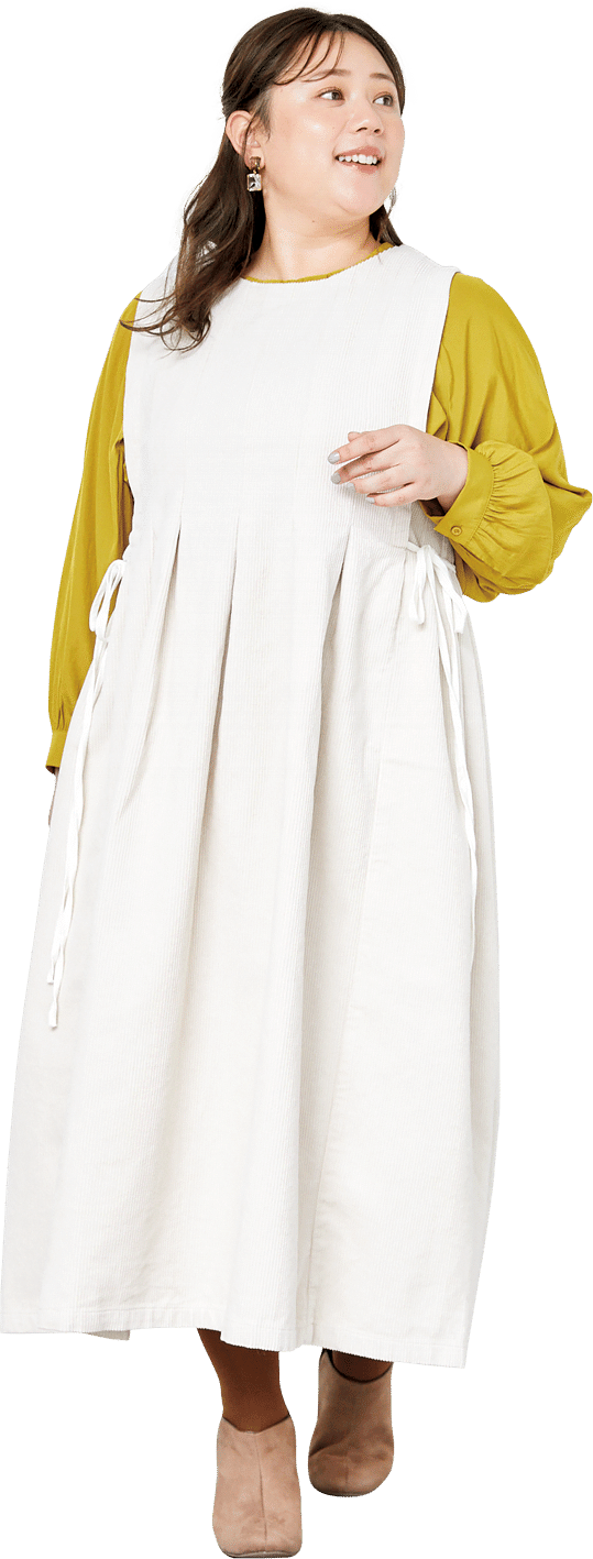 胸元からウエストにかけて贅沢にとったタックで、品よくスッキリ。両サイドのリボンがウエストマークのアクセントに。季節感のあるコーデュロイの素材も、分厚過ぎず、着膨れしにくいところもうれしいポイント。