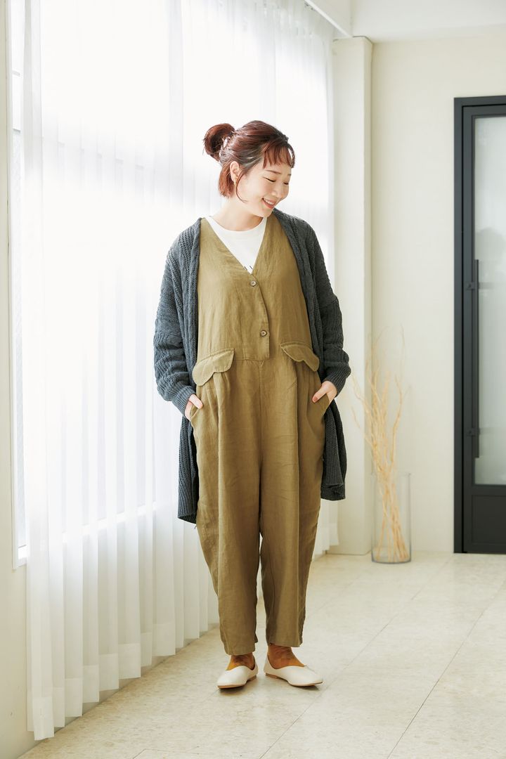 縦ラインを強調するサロペットとロングカーディガンの組み合わせで、スタイルアップ効果抜群。子供っぽくなりがちなサロペットの着こなしも、シックな色みでまとめ、ロングカーディガンを羽織ることで大人っぽく昇華。