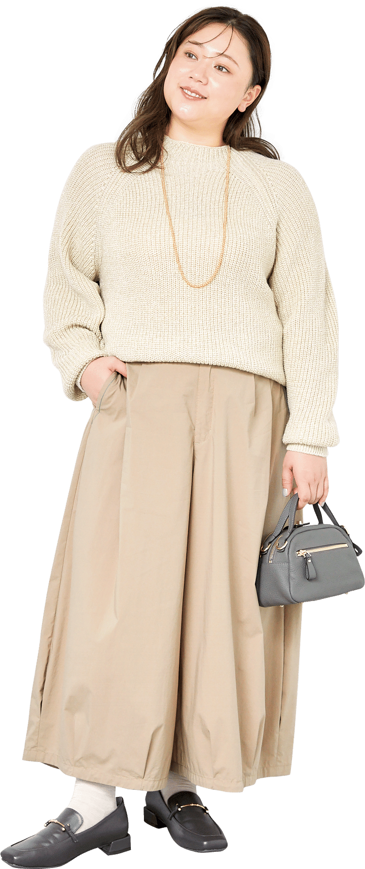 コットンナイロンストレッチコクーンパンツ 15、19号 ¥19,800/super hakka feuille(HAKKA) ニットプルオーバー フリーサイズ(S-3L対応) ¥11,528/CAWAII(ワンピース) ネックレス ¥19,690/Ops. 本革バッグ ¥14,900/HAYNI ソックス ¥1,540/fukuske(福助) スクエアビットローファー 23.5〜26.5 cm ¥5,940/la farfa SHOES