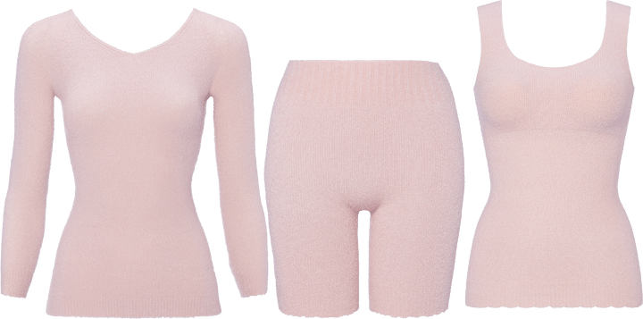 ふわふわのソフトな糸を使用したニットインナー。シームレスで縫い目がないから、肌にごわつかずシルエットもスッキリ。(左)sloggi ホイップタッチ シリーズ 7分丈インナートップ フリーサイズ(M-LLサイズ相当) ¥5,390、 (中央)3分丈ニットパンツ フリーサイズ(M-LLサイズ相当) ¥3,300、(右)同 カップ付きインナートップ フリーサイズ(M-LLサイズ相当) ¥4,840 /すべてsloggi(トリンプ・インターナショナル・ジャパン)