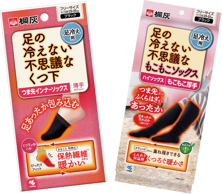 【右】9月に新発売した厚手のソックス。冷え性さんの足をしっかり保温! 桐灰 足の冷えない不思議なもこもこソックス ハイソックス もこもこ厚手 フリーサイズ(23〜27cm相当) ¥2,728(編集部調べ)/小林製薬