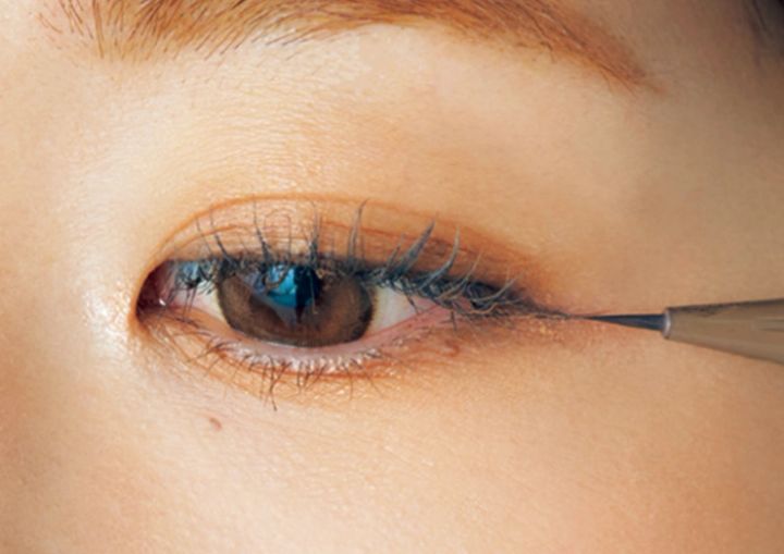 【A】のリキッドで、黒目の中央から0.1mm幅をイメージして、筆の先端をすべらせるように描く。目尻のラインは、約3〜5mmほど長く引くことで、目力が格段にアップ。