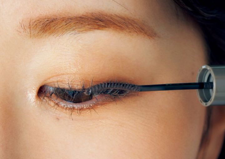コームで毛流れを整え、【B】のブラシをまつ毛の〝中間部分〟から、束を作るイメージで毛先に向かってスッと塗布。根元から塗布するよりも、ナチュラルに盛れて◎。
