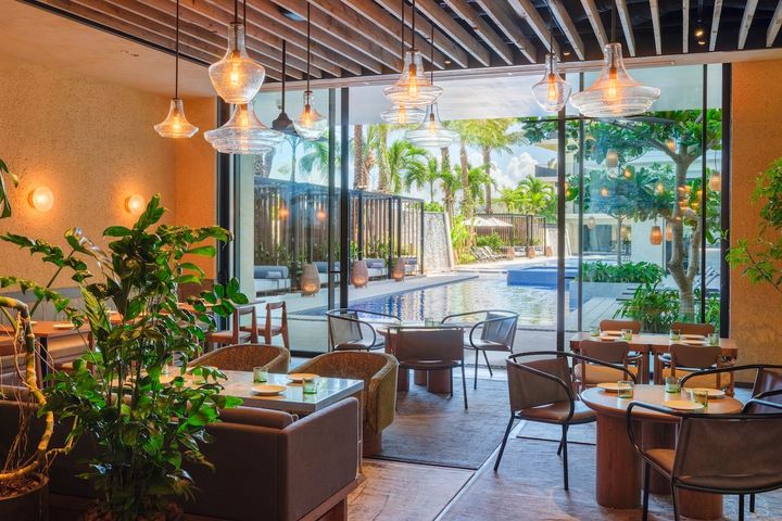 生ハーブを使ったオリジナルフレーバーのシーシャ(6000円~)やダイニングレストラン「BATIDA」の食事も楽しめます。美しいグリーンとファミリープール、ホテルを見渡せるテラス席は特等席。
